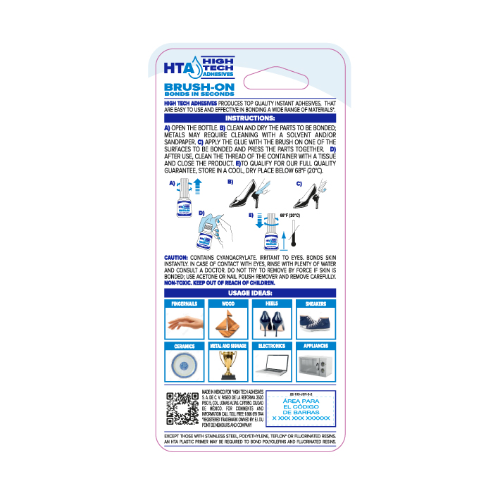 A) Open the product. B) Clean and dry the parts to be bonded; metals may require cleaning with a solvent and/or sandpaper. C) Apply one drop of adhesive to one of the surfaces and press the pieces together. D) After use, wipe the container’s threads and tip with a disposable tissue and close the product. E) To maintain full quality assurance, store in a cool, dry place below 20 °C (68°F).