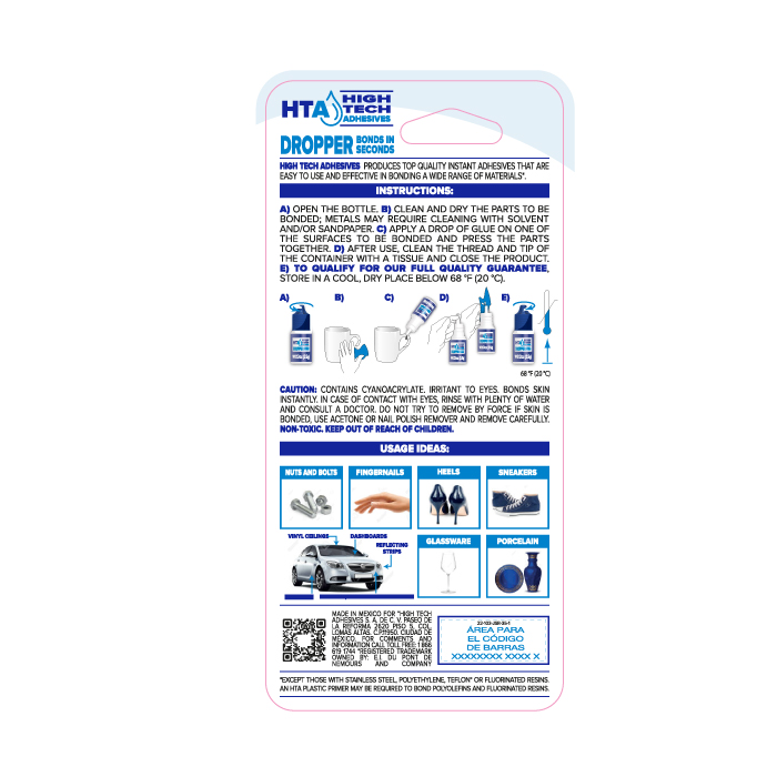A) Open the product. B) Clean and dry the parts to be bonded; metals may require cleaning with a solvent and/or sandpaper. C) Apply one drop of adhesive to one of the surfaces and press the pieces together. D) After use, wipe the container’s threads and tip with a disposable tissue and close the product. E) To maintain full quality assurance, store in a cool, dry place below 20 °C (68°F).